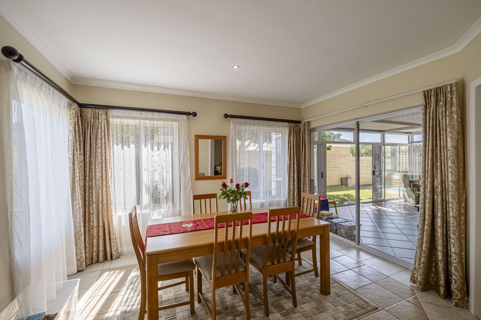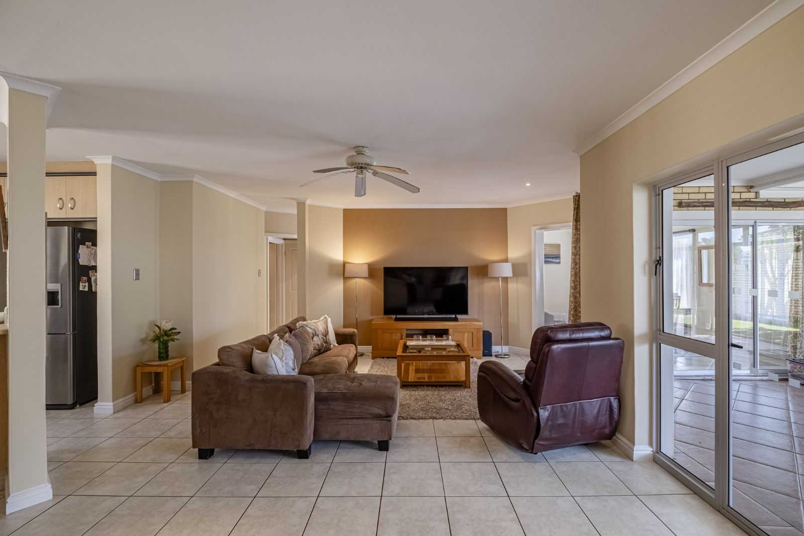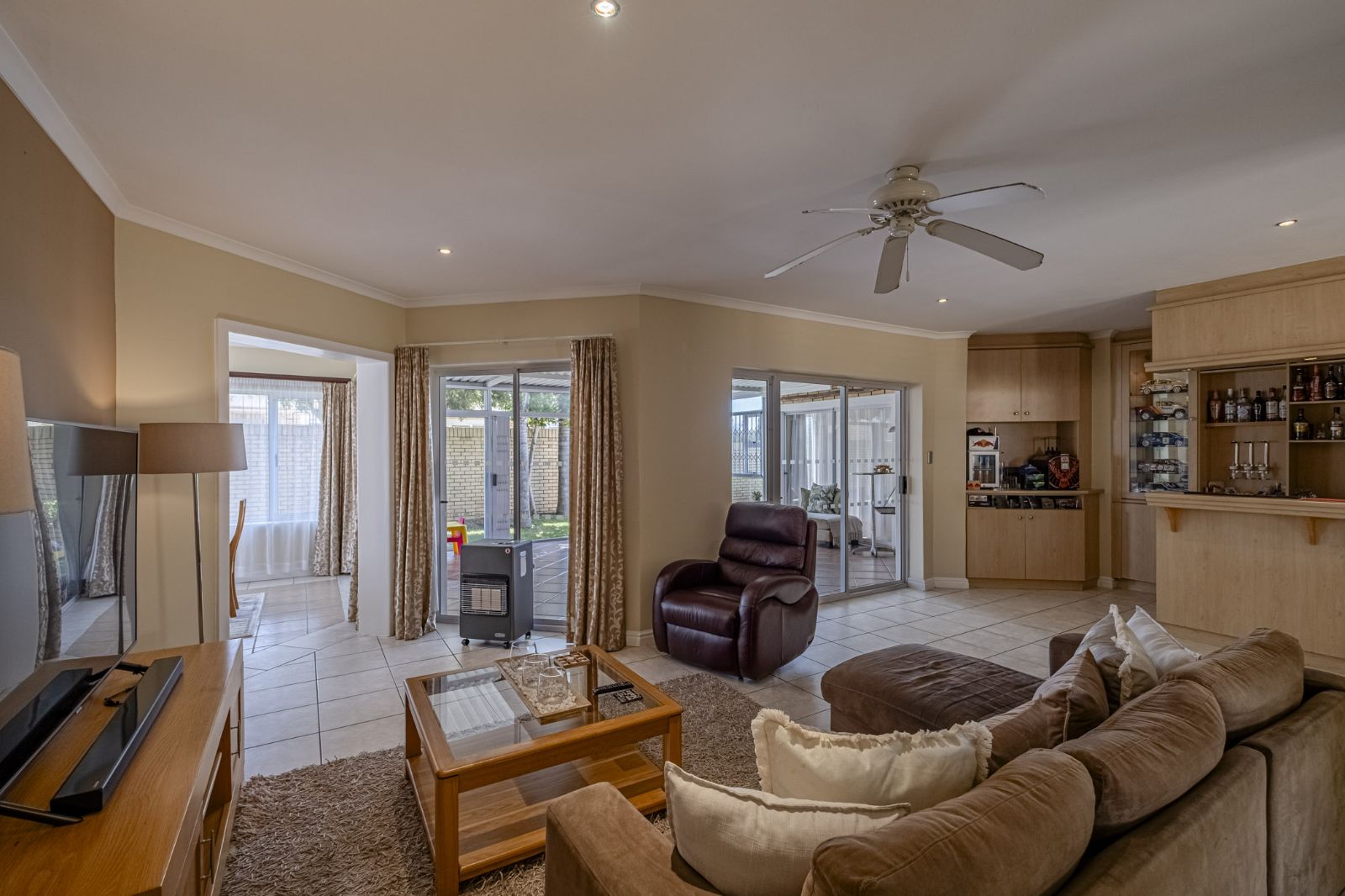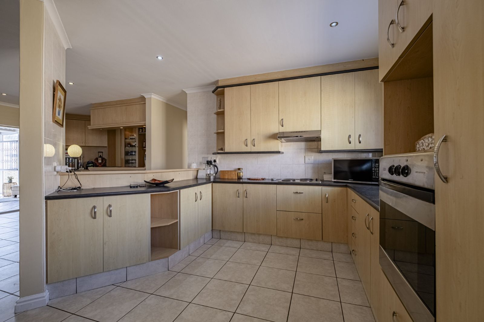 The modern kitchen offers ample cupboard space and a separate scullery, flowing effortlessly into the open-plan dining and lounge area. Entertain in style in the enclosed braai room, complete with a built-in bar, opening out to the pool area — perfect for year-round gatherings with friends and family.