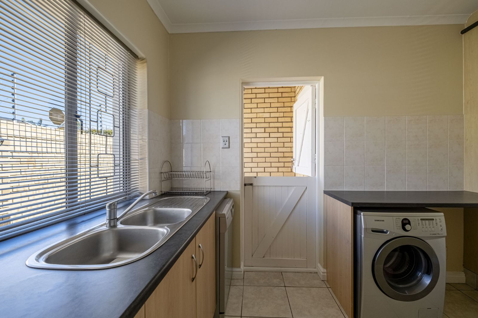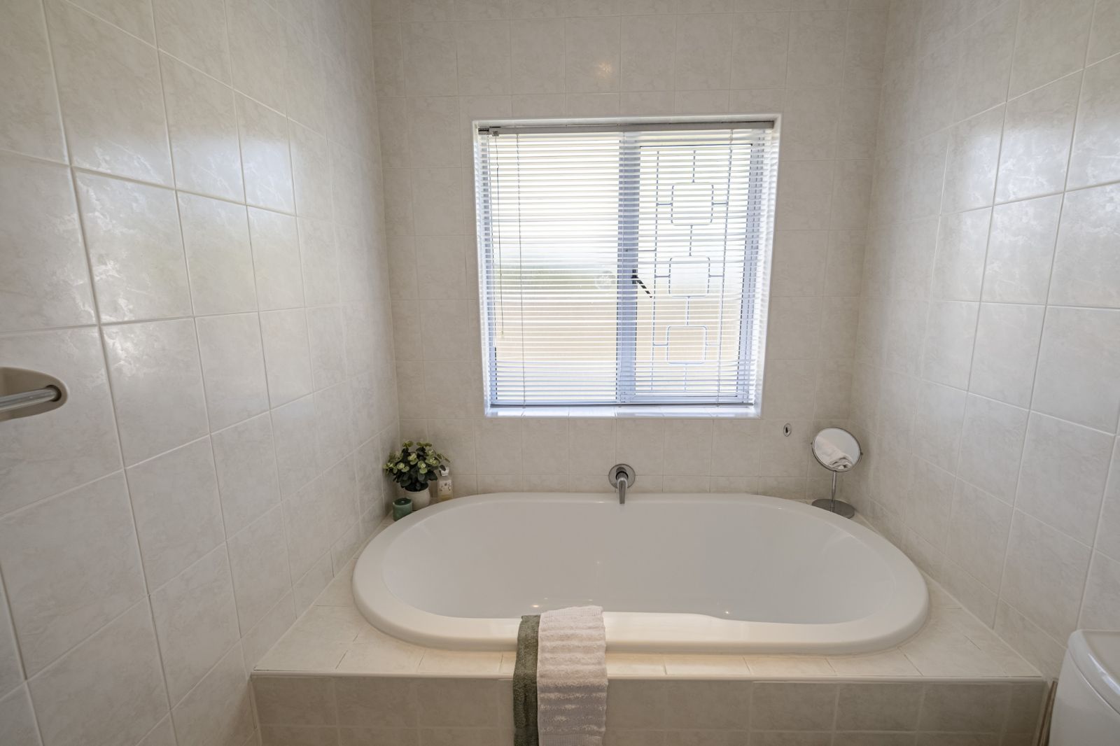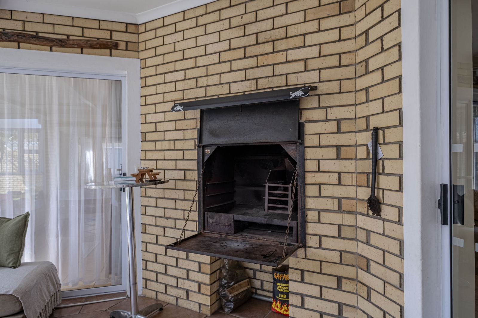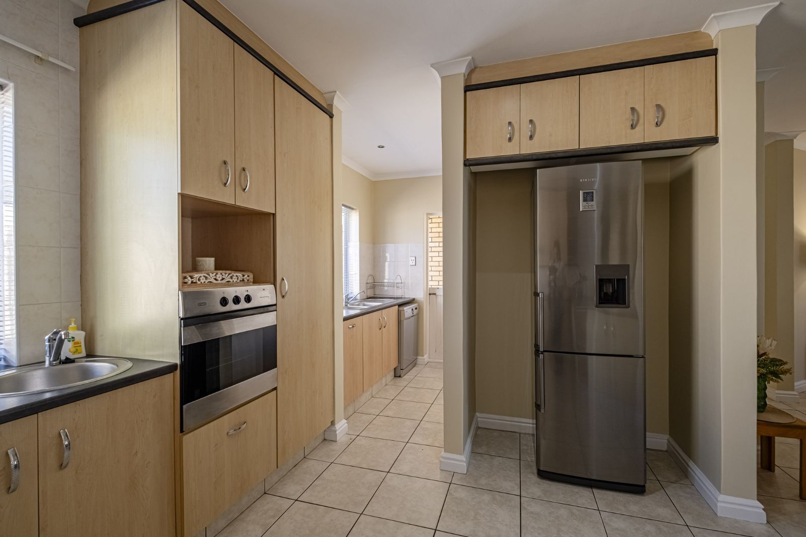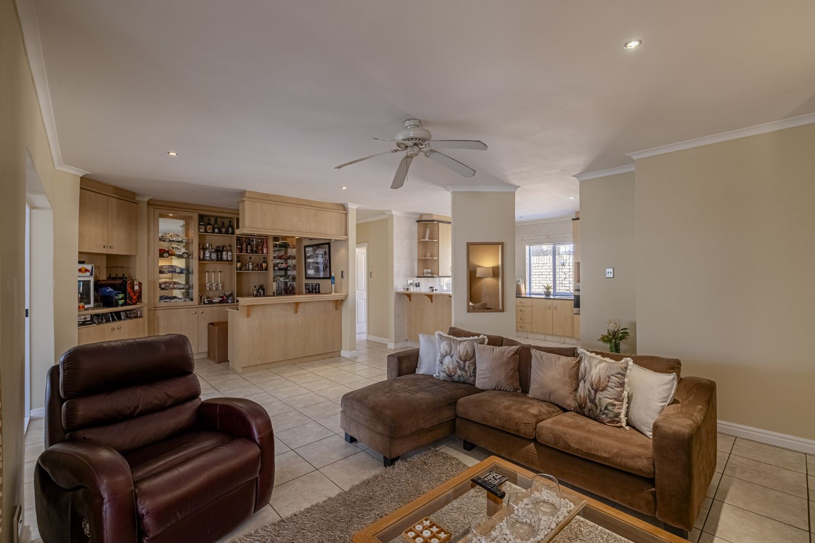 The modern kitchen offers ample cupboard space and a separate scullery, flowing effortlessly into the open-plan dining and lounge area. Entertain in style in the enclosed braai room, complete with a built-in bar, opening out to the pool area — perfect for year-round gatherings with friends and family.
