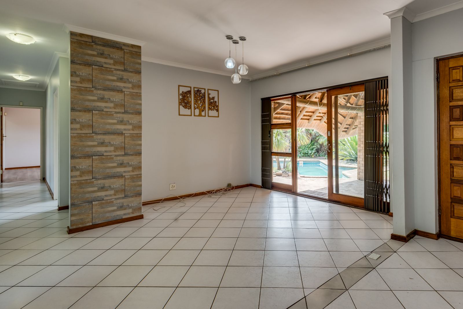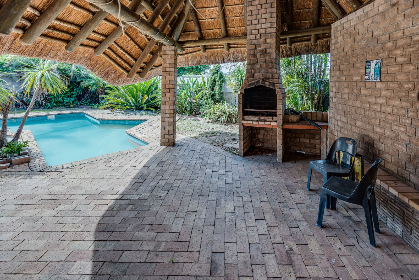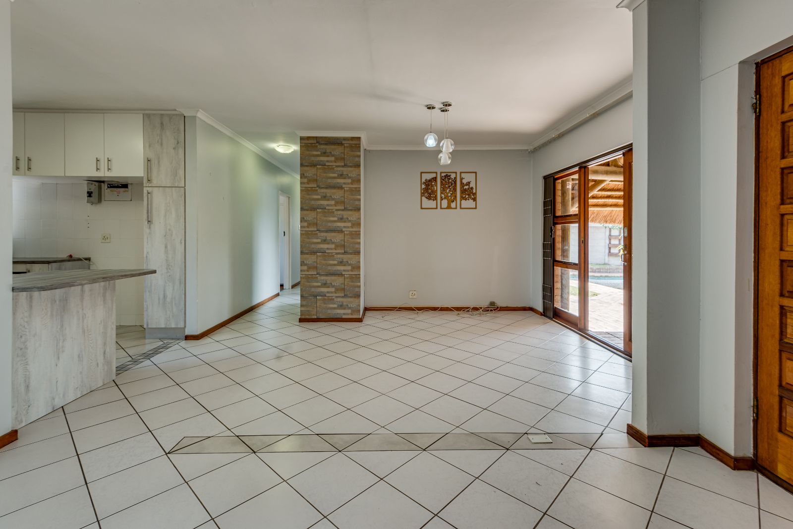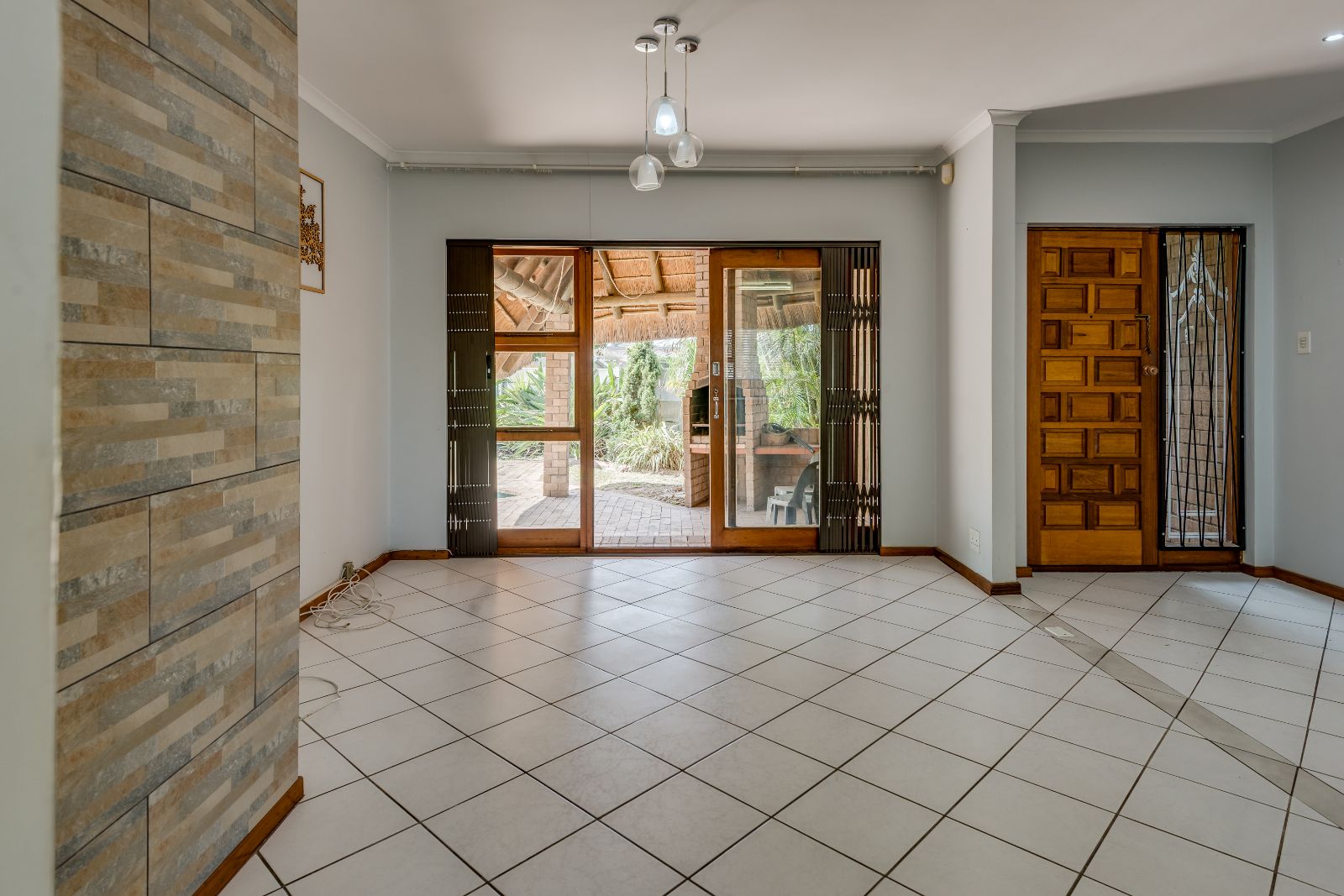 Enjoy effortless open-plan flow: to the left of the entrance is a cosy lounge, leading through to the dining room, which connects seamlessly to a beautiful, modern kitchen, complete with the option of gas or electric cooking. A separate family room features wooden glass sliding doors that open onto a thatch lapa with built-in braai, overlooking the sparkling swimming pool, perfect for year-round entertaining.